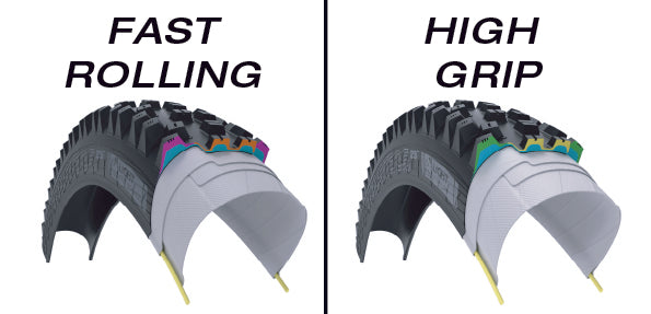 Fast Rolling tires feature a fast and efficient centerline (shown in orange) compound, paired with a softer, but still efficient, compound for the side knobs (purple). Fast Rolling tires prioritize speed and efficiency above all else. High Grip tires feature noticeably softer centerline (yellow) and side knob compounds (green) to increase grip and confidence. High Grip tires prioritize traction in all conditions.