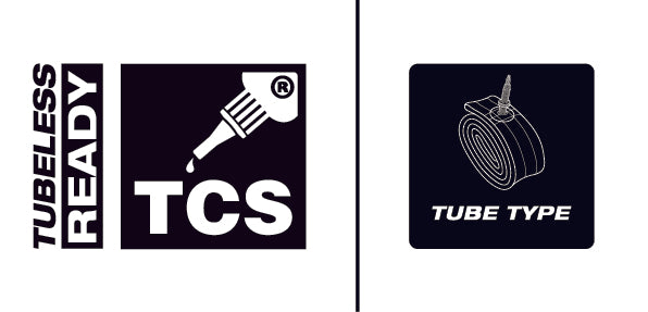 Our TCS tubeless-ready tires rely on a tubeless bead and sealant-based system to retain air and secure the tire bead on the rim. Comp tube-type tires feature a wire bead that cannot be folded and require an inner tube to be installed within the tire. Race tube-type tires feature a folding bead but still require use of an inner tube.