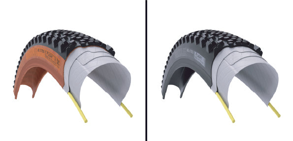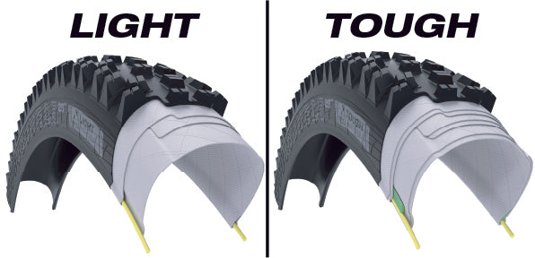 TCS Light tires feature a single-ply casing whereas TCS Tough tires are dual-ply. XC and trail riders often choose TCS Light tires for their minimal weights while enduro, gravity and e-bike riders prefer TCS Tough for the additional durability and cornering support. Some riders opt for TCS Light on the front where weight is more noticeable and TCS Tough on the rear where a burlier tire is beneficial. Most of our TCS Light mountain tires feature SG2 technology, which provides bead-to-bead protection spanning the entire sidewall to provide extra puncture protection without the weight of a dual-ply casing.